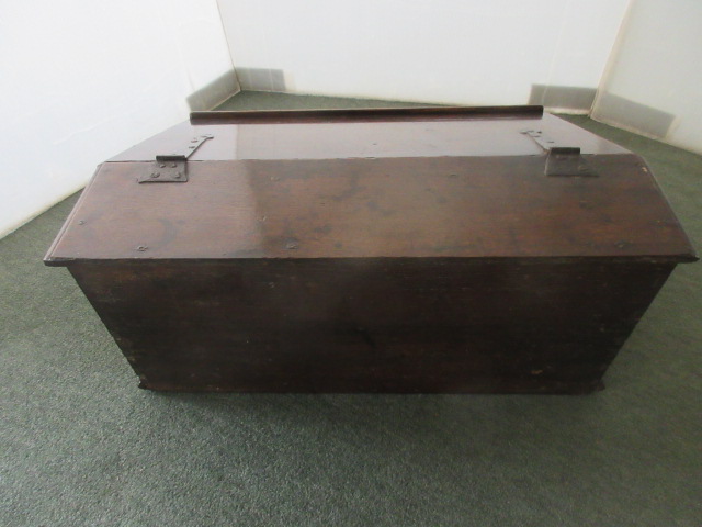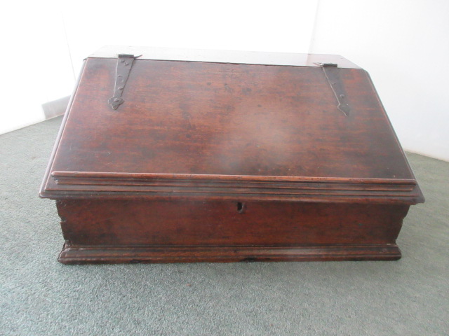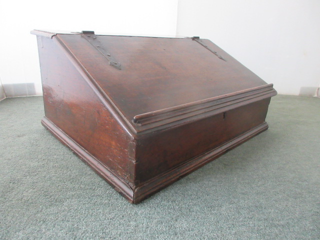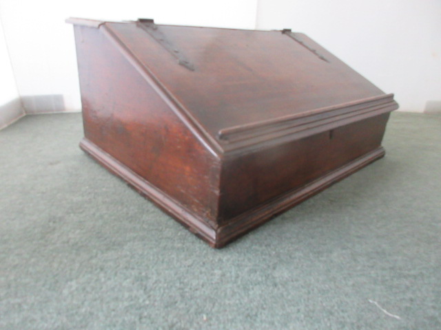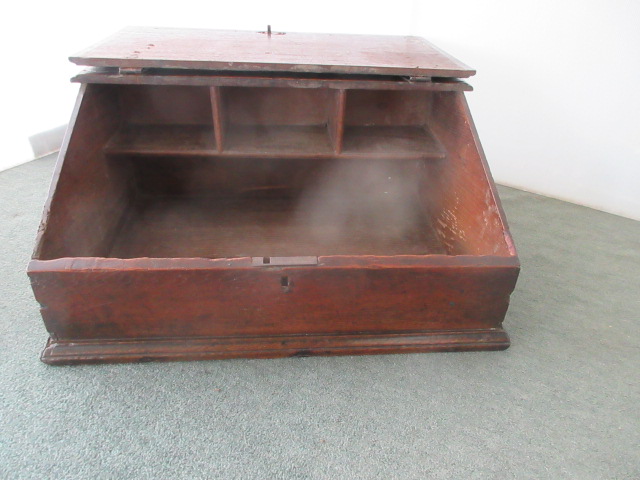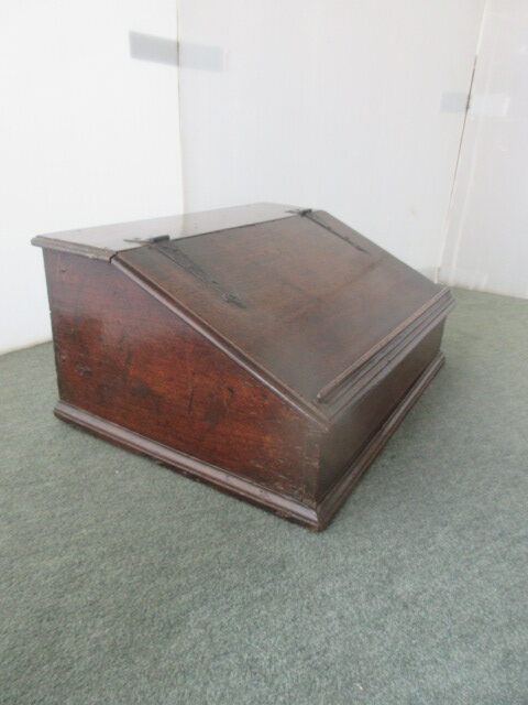 Period Oak desk top/ Bible box with iron hinges, very good colour, 3 pigeon holes inside.