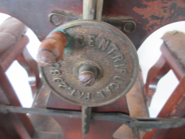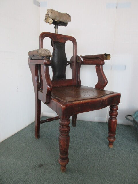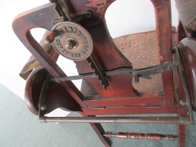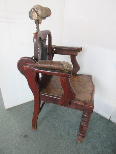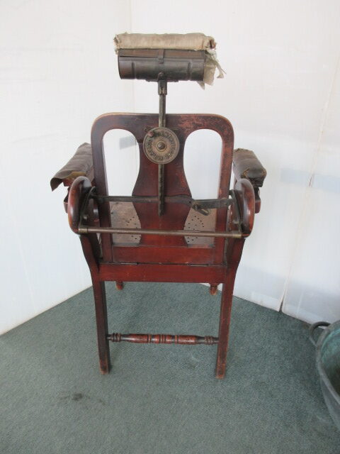Barber’s chair with unusual mechanism. Wooden Structure with brass fittings , it has an adjustable back & headrest. Patent no 29800 Centrifugal on the brass fitting as pictured. Slot in the headrest for the cut throat razor. Headrest is also patented