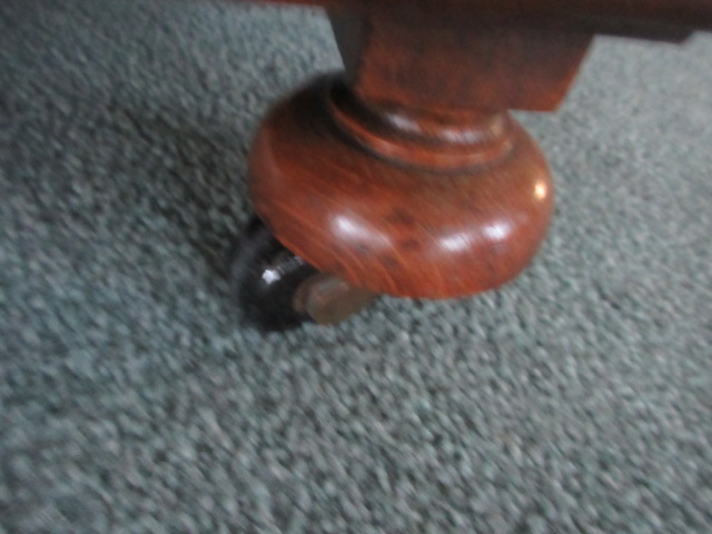 The cupboard has two shaped shelves. It is on bun feet with castors, Brass drop handles.