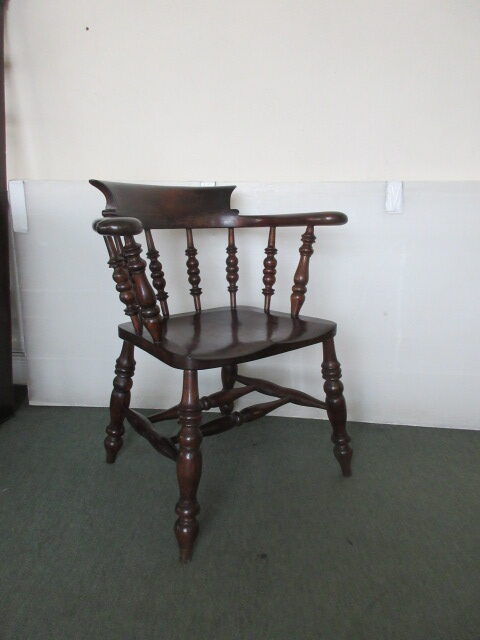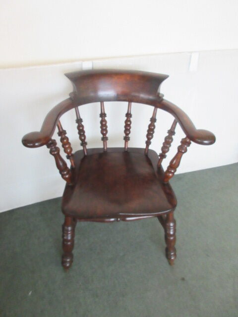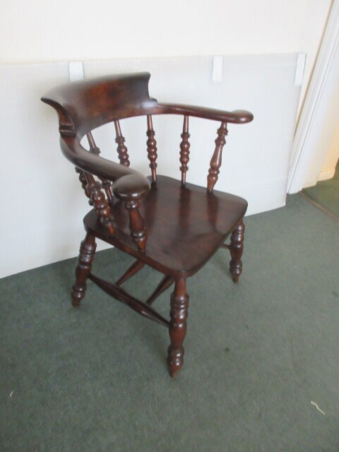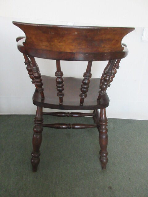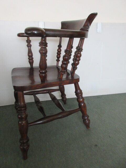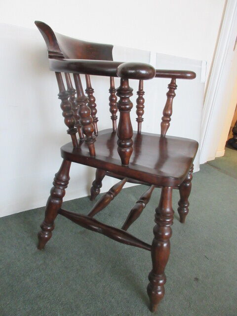 Victorian circa 1880 smokers bow captains chair . This chair features a timeless design complete with shaped arms, shaped back and turned legs with double stretchers between. The chair has a lovely solid sculpted seat and ornately turned front legs. It is solid with no loose joints or wobbles.