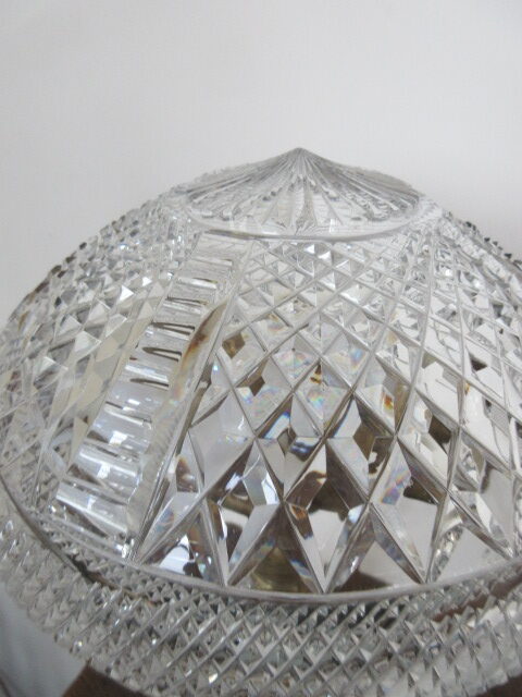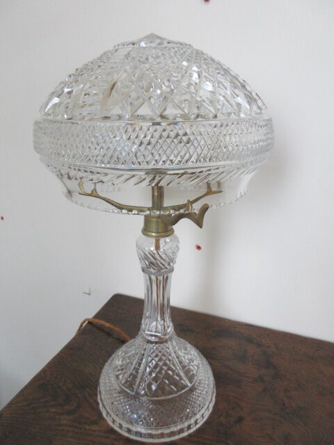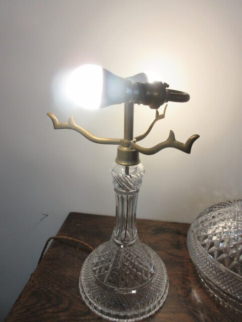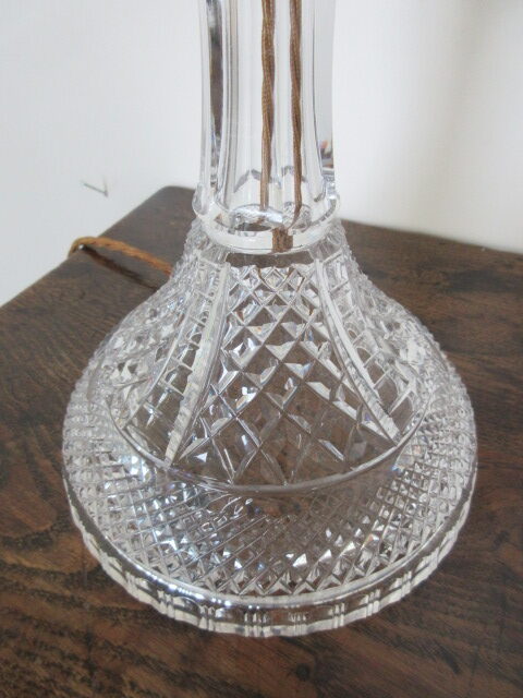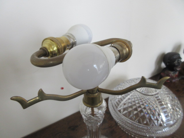1920’s cut glass lamp with double bulb holder, silk wire & pac tested, brass shade holder.