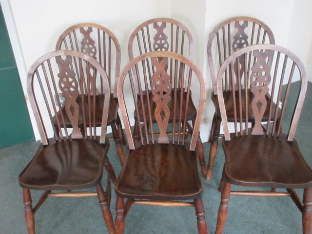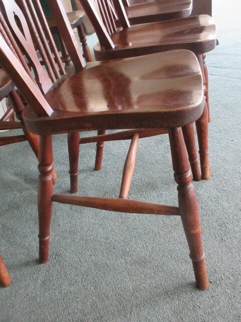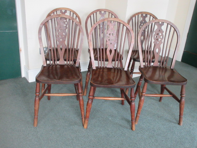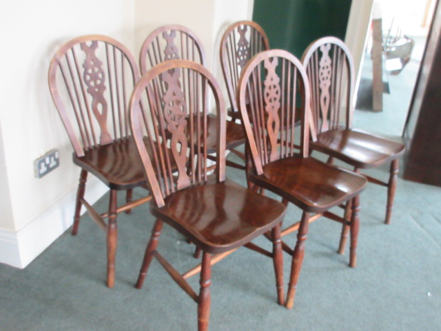 set of 6 wheel back kitchen chairs with one piece seats , nice colour & in good condition.